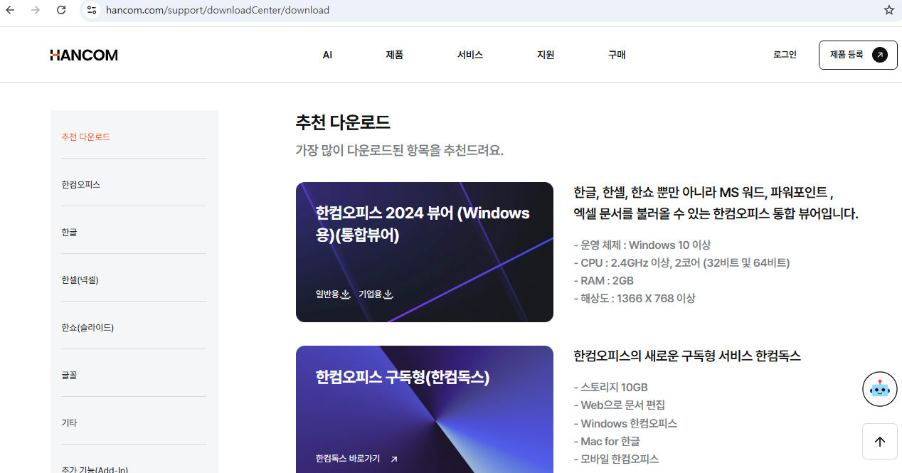 - 홈페이지에 접속한 후, 상단의 '지원' 메뉴에서 다운로드센터 > 다운로드를 클릭합니다.